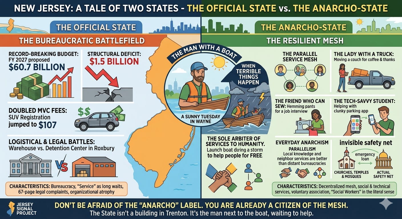 But there is a second New Jersey. It doesn’t have a seal, it doesn’t have a deficit, and it doesn’t require a permit to operate. This is the Anarcho-State: a resilient, decentralized mesh of social and technical services that exists not because of a mandate from Trenton, but because your neighbors happened to show up.